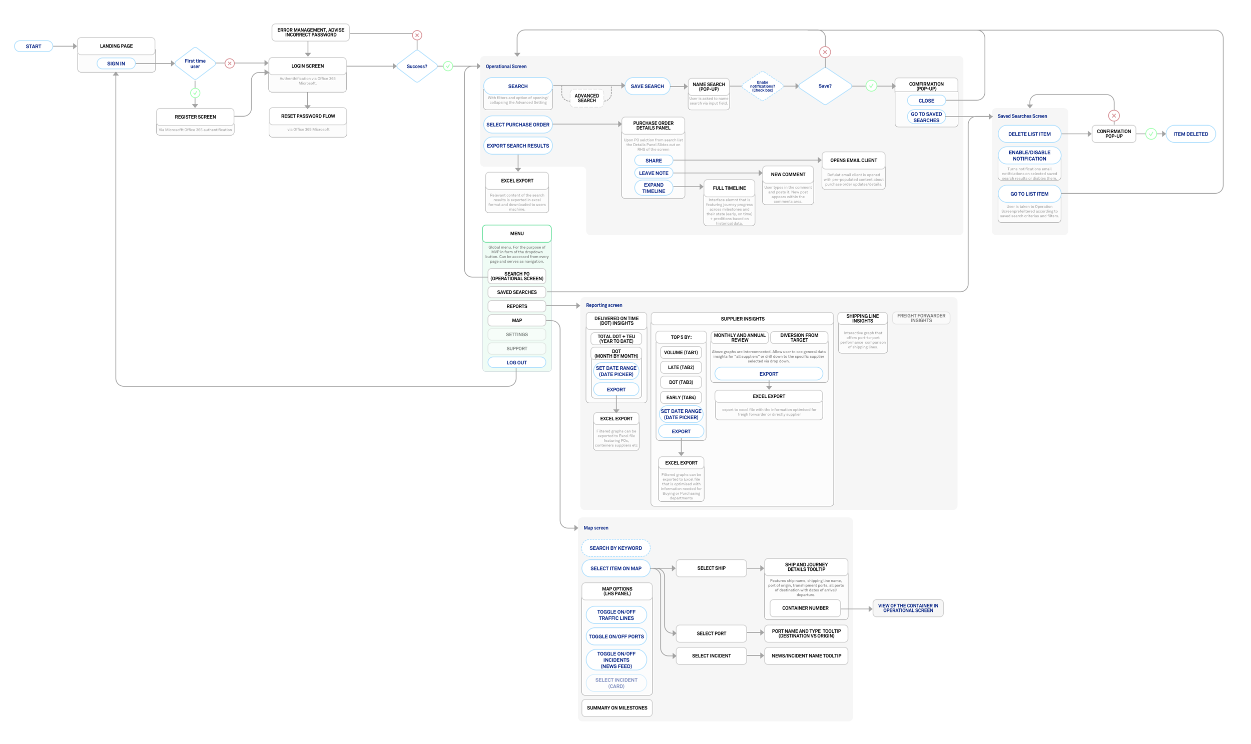 Best of interative approach to design development we were able to arrive at simplified solution of the most important milestones. Originally through the workshop with the users I managed to identify all the milestones of the freight journey that operational assistant will track. Next, I tried to identify only actionable milestones to understand which one of them trigger actions that will later serve as a base for designing notifications. Finally, milestones have been grouped where possible and language standardised, bringing even more siplification while maitaining all valuable insights.